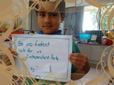 Room 10 students have been busy learning about General Election 2011 and how the voting system in New Zealand works. Last week Room 10 students worked very hard in small groups to create election posters.Each group selected a candidate and a party name and thought very carefully about the aims for their party. After that each group created a poster. The candidates have been memorising their party names and party policies(aims). This week the students will go to some classrooms to encourage students to vote their party and their candidates (leaders). Keep looking at our blog to find out who wins!