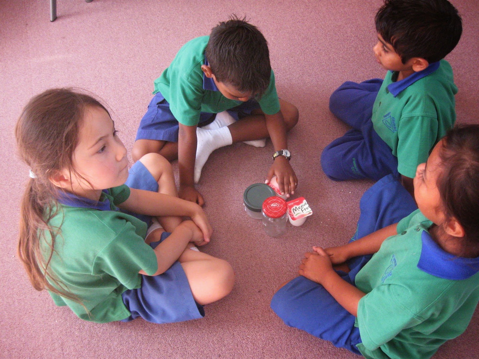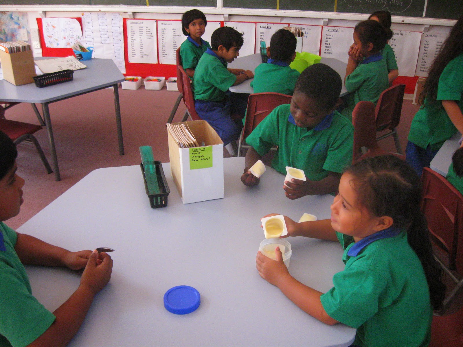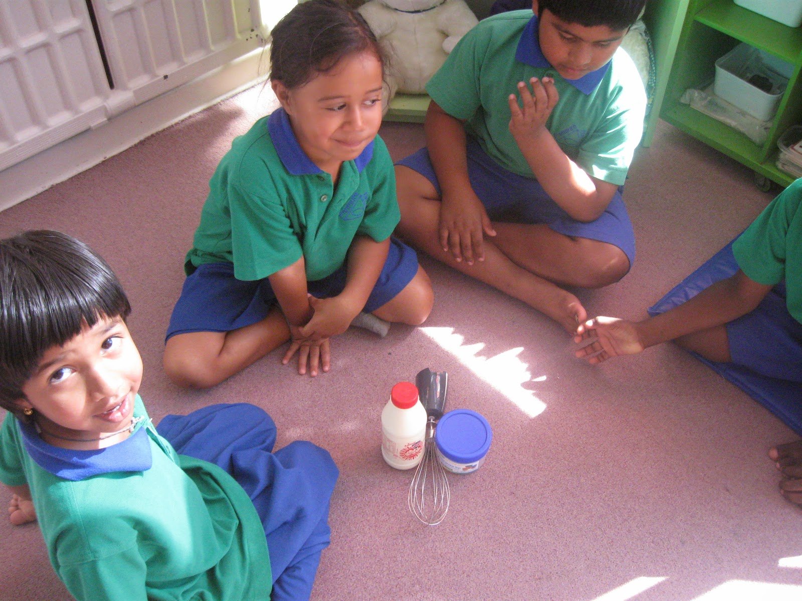 As part of our milk unit, Room 10 made several attempts at finding out how butter is made. The students were divided into four groups. Three tables were step up with the ingredients and the materials for making butter. The students had to select only one item from each  table and try to make butter.